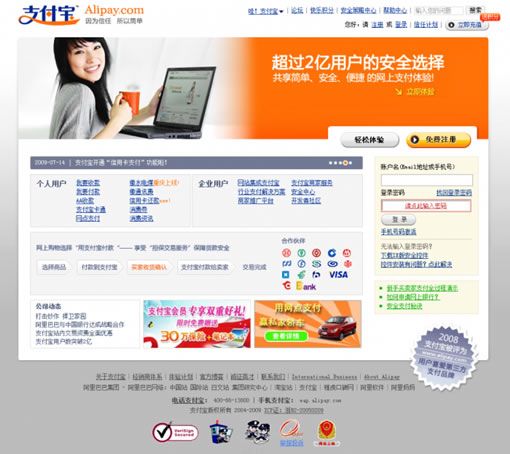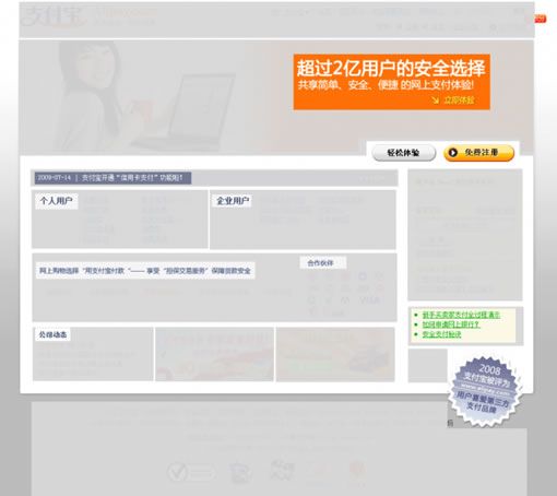 支付寶:大banner分為2塊,左邊是代表著用戶的大美女,右邊是體現(xiàn)實力的宣言“超過2億用戶的安全選擇”,輔助小字為:共享簡單、安全、快捷的網(wǎng)上支付體驗,具有親合力的美女,醒目的大標(biāo)語,傳達(dá)給用戶的信息,支付寶的內(nèi)容構(gòu)思很明顯比財付通更直接有效。