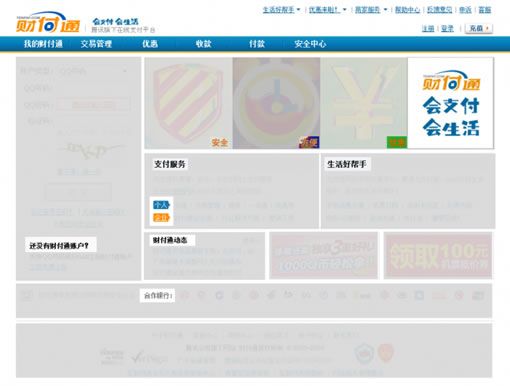 財富通:支付服務(wù)(含個人和企業(yè)),生活好幫手,還沒有財富通帳戶,支付好幫手,合作銀行,共5塊主要內(nèi)容,兩個廣告區(qū)。
