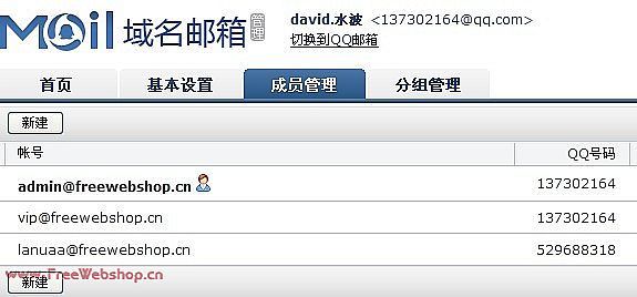 第10步: 看一下成員管理~~超爽~~~以后企業郵箱,別人發admin@freewebshop.com,用QQ就可以直接收到郵件了!!!!