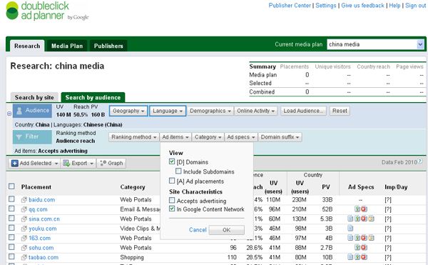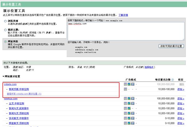 a、通過Google Ad Planaer 及Google Adwords展示位置工具(根據行業、描述、網址條件篩選目標站點),尋找高質量的內容網絡站點。Google Ad Planaer支持國家、地區、語言、行業、所支持的廣告規格等綜合條件來篩選目標站點。
