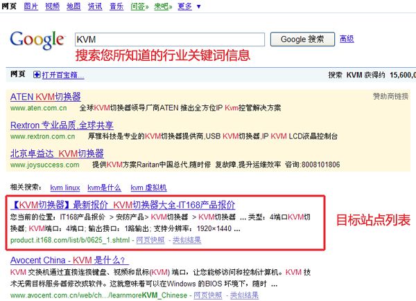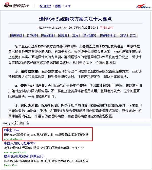 谷歌內容廣告關鍵字匹配機制,是對細分群體定位的關鍵設置。(設置關鍵字匹配機制前,您一定要先了解您目標客戶的關注點) 如果您設置過多的關鍵詞,那很有可能很多潛在的客戶根本無法看到你的廣告;如果您設置的關鍵詞太少,會影響匹配的精確性。在上面的圖示中,我們可以看到新浪上”KVM”相關的文章,匹配到K博士這組廣告。如果有許多競爭對手同時也投放到此網站,并且也是定義的”KVM”關鍵詞,在出價相同的條件下,K博士這組廣告毫無優勢可言,但是如果我們定義2個關鍵詞”KVM”+”解決方案” 那么在這組頁面中我們的廣告相關性就更高,在出價相同的條件下,我們可以獲得更多的展示機會。