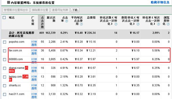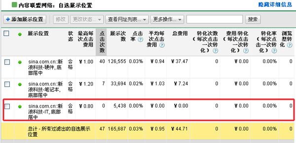 如果您啟用了Google Adwords轉化跟蹤工具,您也可以看到每個站點對應的轉換數據。我們可以根據每次轉換成本來評估媒介的質量。但是Google Adwords轉化跟蹤如果配置不合理可能會嚴重影響對媒介質量的判斷,依靠谷歌分析來分析流量質量會更可靠一些。