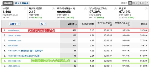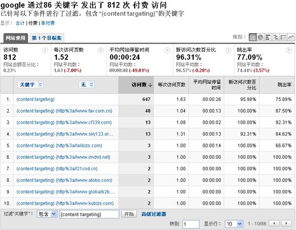 我們可以通過幾個重要指標來評估內容站點的質量(平均停留時間、跳出率、KPI轉換率),排除流量質量和KPI轉換效果較差的站點,添加新的相關內容網絡站點。不斷執行優化的過程中,您可能會驚喜的發現您的廣告投資回報率在不斷增長。 如果您的Google Adwords帳戶已經和谷歌分析(Google Analytics)帳戶鏈接整合,那么您可以通過谷歌分析報表數據,分析出以網站定位廣告系列中的所有站點的質量。