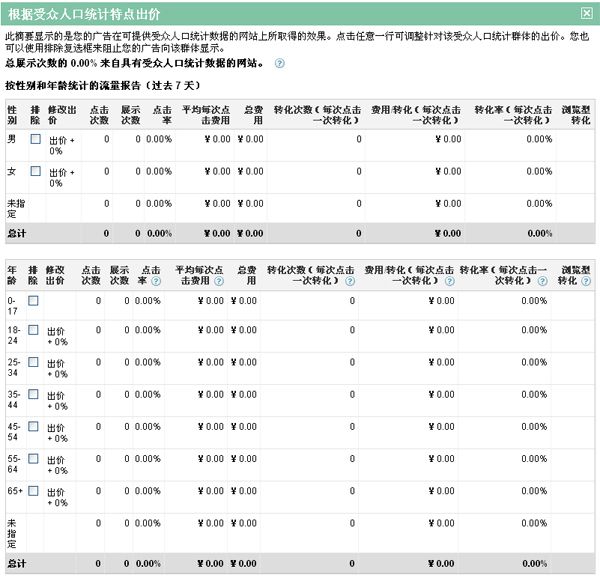 谷歌內容網絡最具特色的一個功能,針對群體性別和年齡來定位,我們可以排除一些不可能使用我們產品的群體,還可以針對不同的群體設定不同的出價比例。 例如:我們在推廣一款網站分析監測的產品,這部分群體大部分都是WA分析師在使用,群體大致在25~34歲之間,那么我們可以將此年齡群體的出價提升10%,這個群體類型的用戶將會有更多幾率看到我們的內容網絡廣告。 這個功能準確性有待驗證!