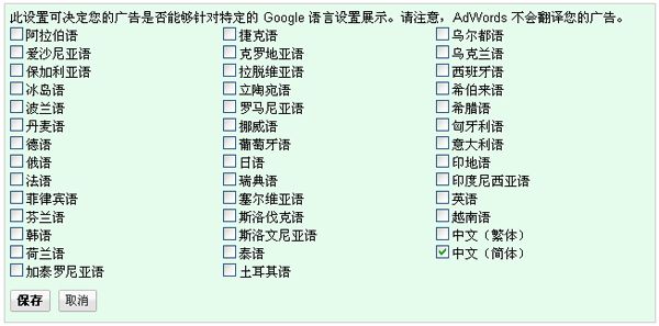 谷歌內容網絡語言定位設置,直接關系到你投放廣告的精確性。試想如果您在阿拉伯語系的國家投放西班牙語的廣告,或者您在巴西投放德語廣告,會有什么后果!如果你在投放簡體中文一個語系的廣告,直接選擇簡體中文語言的配置即可。 如果您在投放多語系的廣告,就需要研究當地國家什么語言是官方語言。需要注意的是:選擇語言配置后當然也要制作針對這個語言的廣告創意和Landing page頁面。