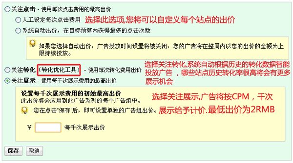 通常我們選擇”人工設定每次點擊費用”即可! 如果我們投放的站點廣告點擊率非常之高,或者我們投放站點競爭對手廣告非常多,那么我們可以考慮采用千次展示費用出價,盡可能獲得更多的展示機會。總之您可以嘗試不同的出價模式,看哪種模式投資回報率更高了! 按照展示來出價的選項必須要啟動谷歌ADWORDS轉換優化工具,才可以使用!系統會根據歷史轉換來智能投放,歷史轉換高的站點有更高的展示機會,此選項不建議新手使用。我曾經嘗試過使用此選項,但是轉化效果遠不如使用“人工設定每次點擊費用”選項配置。