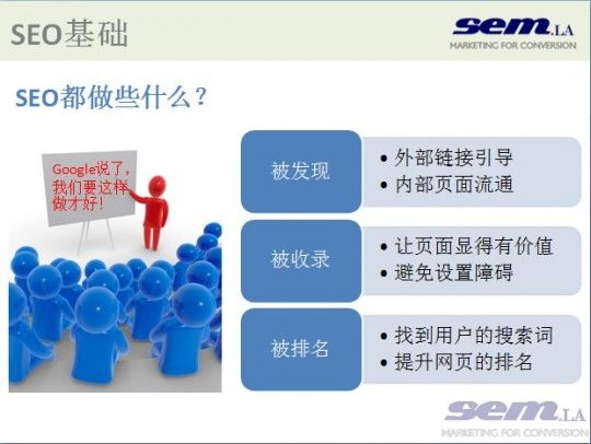 在整個應(yīng)對、處理、解決、提高的過程中,SEO其實是比較被動的,所有的做法都是針對搜索引擎和用戶的喜好而進行的。所以,我在PPT里使用了09年最流行“被字句”,而與一般的“被XX”不一樣,我們是希望被“被XX”而不是抗拒(囧!)。